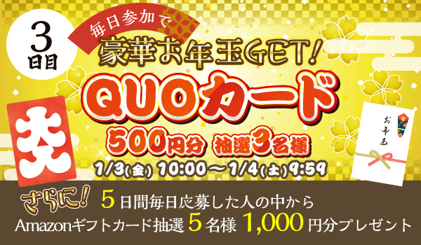 1/3 QUOカード500円分が抽選3名様に当たる♪